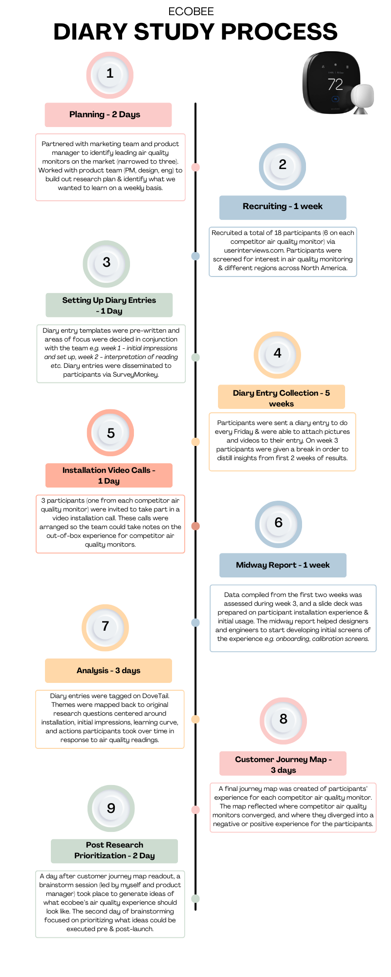 The team aimed to learn how people use the air quality monitor over time and how their usage may change. They sought to find ways to make the experience user-friendly, guiding users to improve air quality. I suggested a diary study as it would help us deep dive into participant behavior over time. A slide deck was presented to the team after the first two weeks of data was collected, in order to help the team start building out the initial onboarding experience.